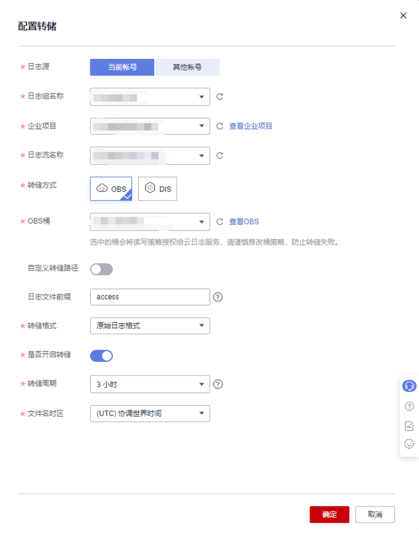 - 控制台进入日志转储界面,选择转储对象后点击配置转储