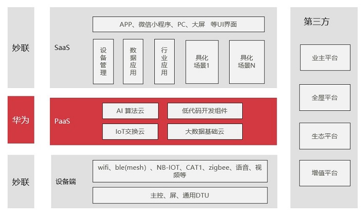 同时,妙联也提供WiFi、蓝牙、Zigbee、NB-IoT、4G-CAT1、语音、视频等种类齐全且可快速定制的模组,帮助企业完成智能设备的定制开发或改造。 最终,产业链上下游的伙伴都可以在华为云打好的PaaS底座上,实现生态圈的互联互通。