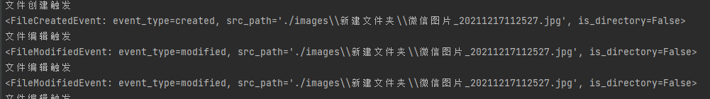 watchdog.events.FileCreatedEvent():文件被创建时触发该事件;watchdog.events.DirCreatedEvent():目录被创建时触发该事件;watchdog.events.FileDeletedEvent():文件被删除时触发该事件;watchdog.events.DirDeletedEvent():目录被删除时触发该事件;watchdog.events.FileModifiedEvent():文件被修改时触发该事件;watchdog.events.DirModifiedEvent():目录被修改时触发该事件;watchdog.events.FileMovedEvent():文件被移动或重命名时触发该事件(event.src_path表示原路径,还有event.dest_path);watchdog.events.DirMovedEvent():目录被移动或重命名时触发该事件(event.src_path表示原路径,还有event.dest_path);