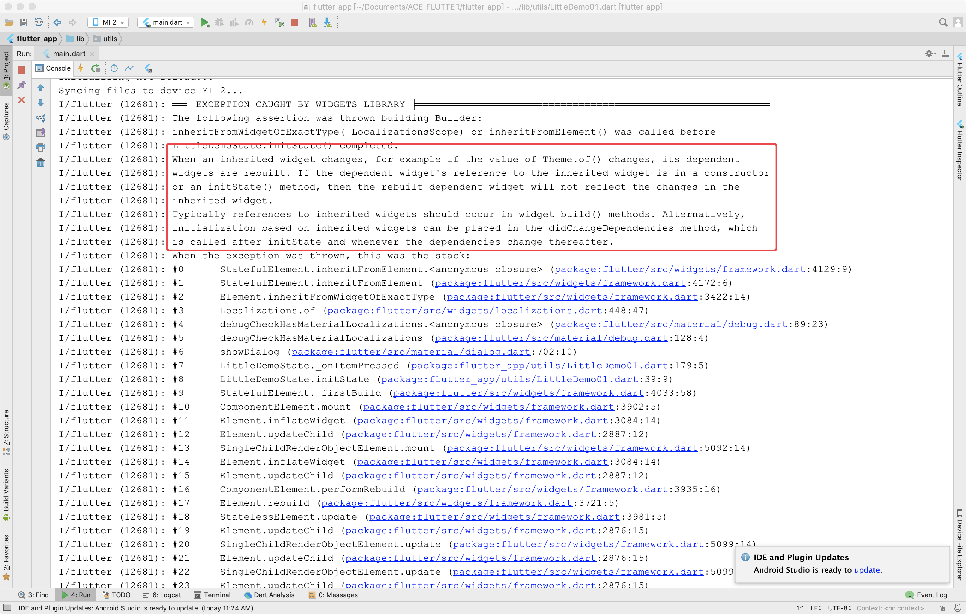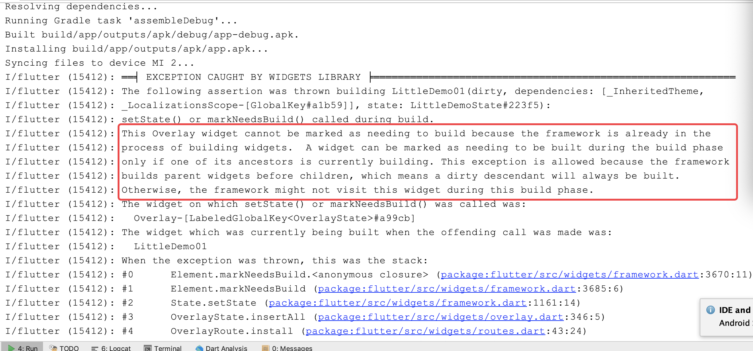 小菜根据错误提示将弹窗位置调整到 didChangeDependencies 和 build 中且异步尝试,同样失败,提示需要父类组件构建成功之后才可以构建子组件;