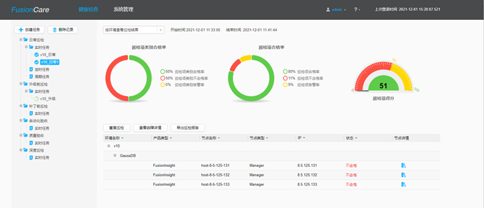 FusionInsight Tool DWS Prober是为技术支持工程师和维护工程师提供的一套健康检查工具,能够检查集群相关节点、服务的健康状态,提前发现集群中潜在的问题,并生成健康检查报告。尤其是节点规模庞大,问题节点排查困难,使用此工具可以快速发现隐藏的问题,提前识别系统的健康状况。FusionInsight Tool由两部分组成:FusionCare和SysChecker。FusionCare提供巡检界面可视化、环境管理、任务管理、报告管理功能。SysChecker提供对FusionInsight的巡检功能。