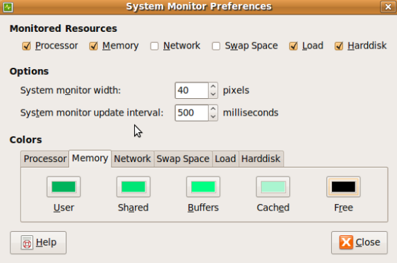 右键单击任务栏面板上显示的进程图,然后选择 ‘Preferences’。选中 ‘Monitored Resources’ 部分下的以下复选框。如果您想监控它们,您还可以选择网络或交换空间。