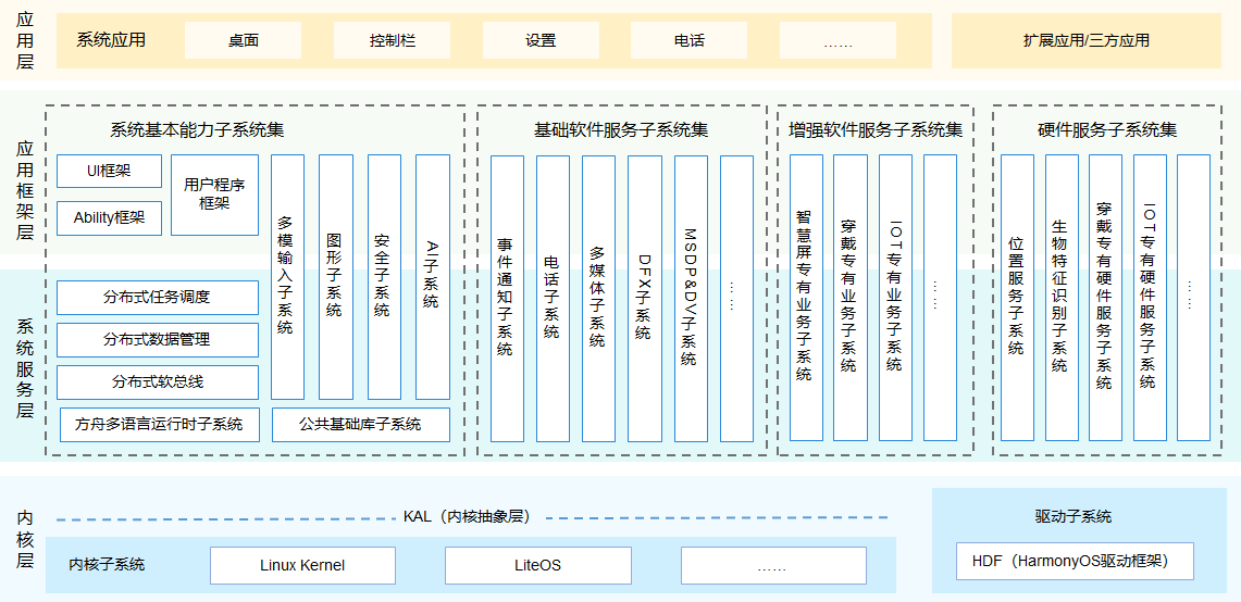在内核之上,鸿蒙还有各种子系统,在子系统之上又有桌面等软件