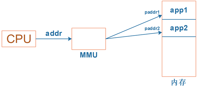 运行app2时,CPU发出的同一个addr,通过MMU映射到paddr2;