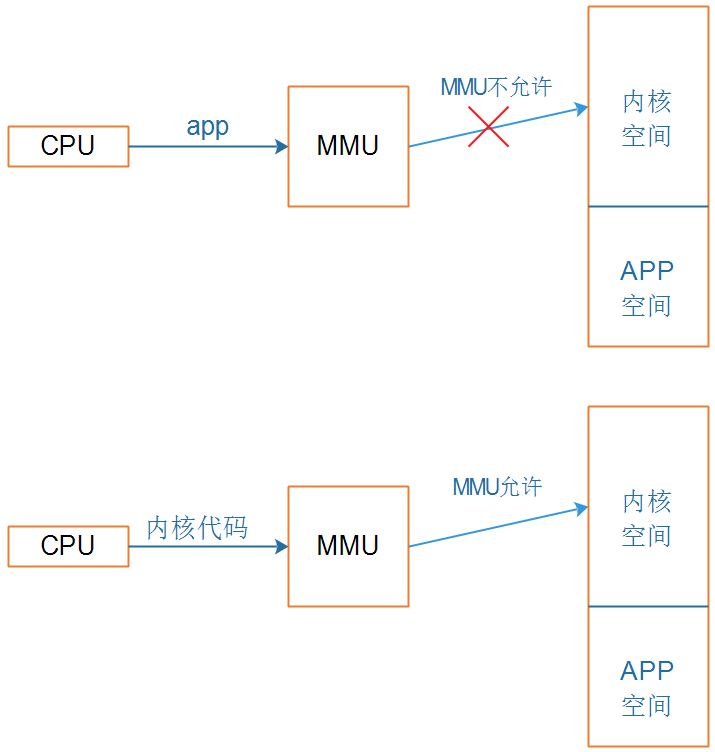 - 使能MMU后,CPU发出的地址被称为"虚拟地址",它不是直接发送给硬件,而是发给MMU