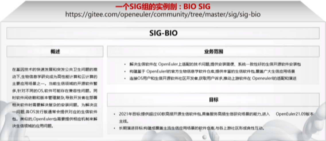 SIG组数量已经超过80个,开始从纯技术引导转变为业务引导。其中一个典型例子为 BIO(生化计算),它体现了openEuler应用范围到了专业的领域,同时发现有人通过社区来构建相关的生态,同时能提出了新的应用模型以及对于芯片的需求是什么。