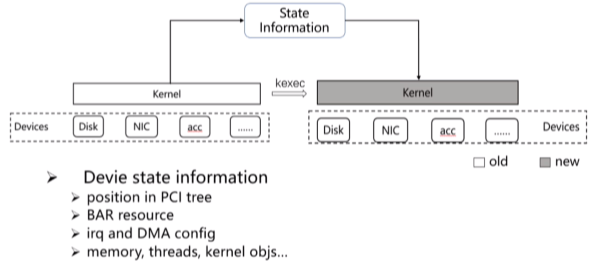 从软件层面重新加载内核,不涉及硬件的改动,但是内核加载后还是会把硬件重新加载,这就导致一些问题。比如:切换内核加载时间长,连接状态发生改变等。故从PCI设备状态保持和驱动状态保持分析。