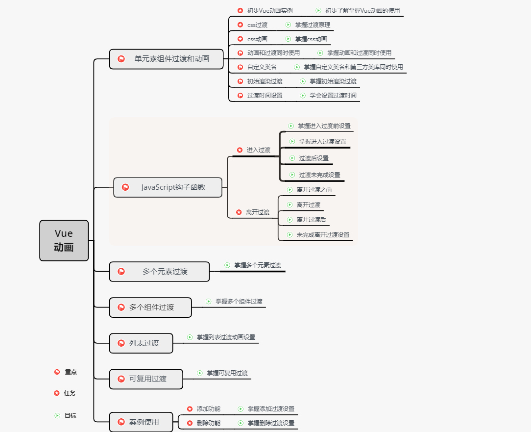 • 单元素组件的过渡使用transition标签,以及v-if,v-show,结合Vue过渡实现组件的切换和过渡。动画主要使用CSS动画和第三方动画库。