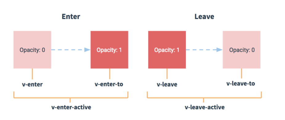 3. v-enter-to:2.1.8 版及以上定义进入过渡的结束状态。在元素被插入之后下一帧生效 (与此同时 v-enter 被移除),在过渡/动画完成之后移除。