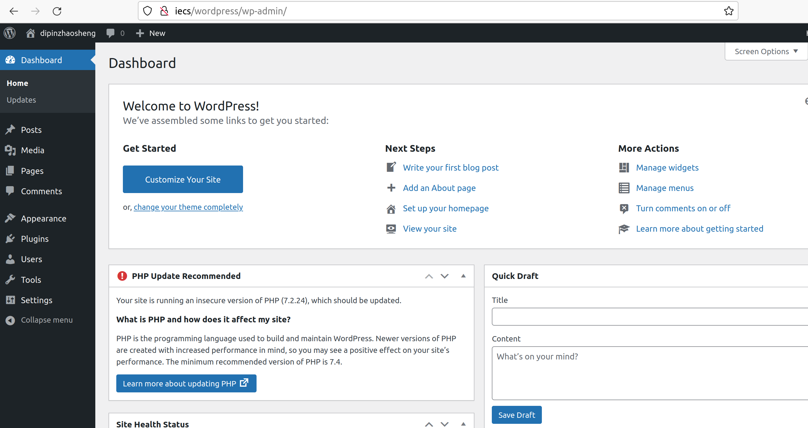 有一个红色的惊叹号,希望最低的PHP版本是7.4,目前CENTOS8.2默认安装的7.2,这个建议在下载wordpress的网站上也有。