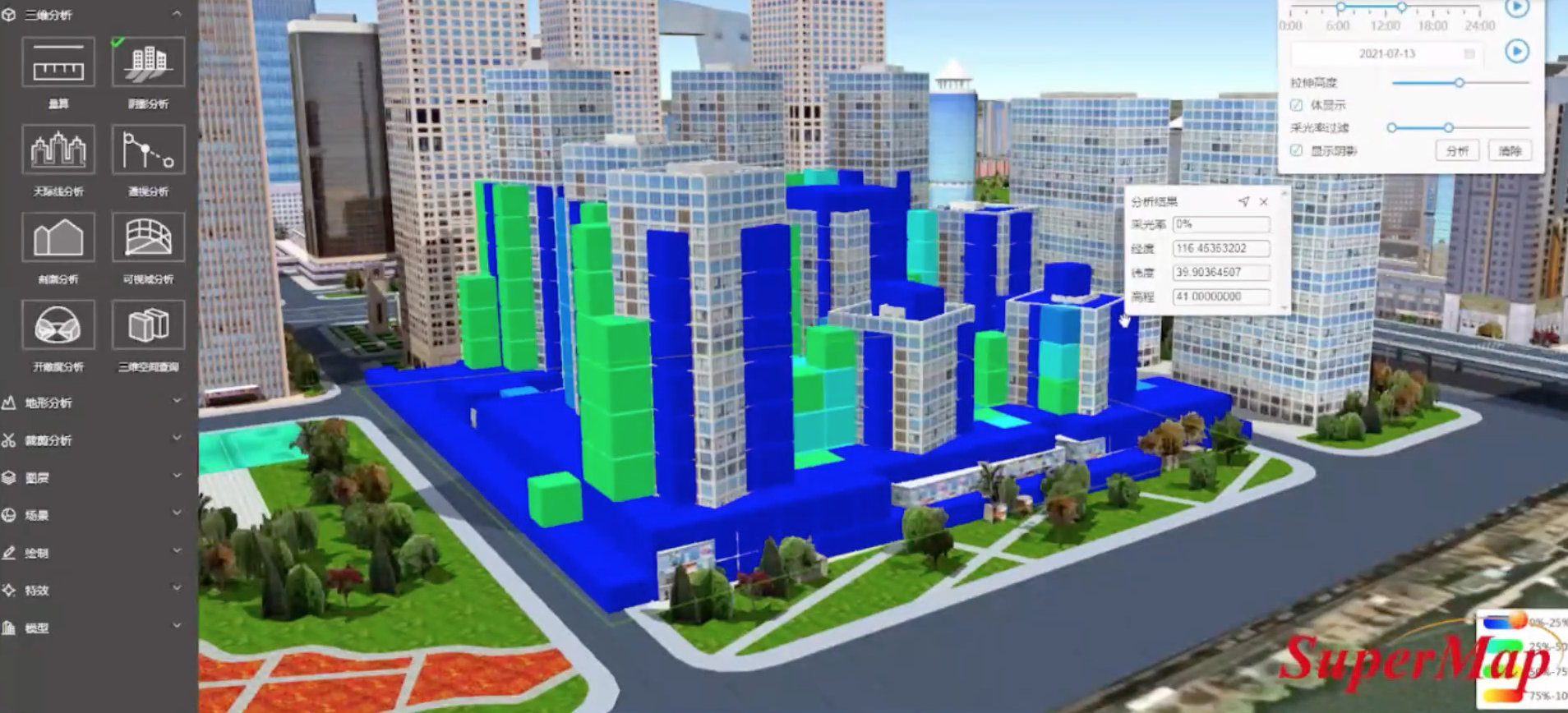 不仅仅在二维数据方面存在应用,在三维数据中也有非常多的应用场景,比如通视分析、三维体空间分析(阴影体)、坡度坡向分析、街廊比动态计算、红线检测、控高分析、地下建筑范围分析、天际线分析、开敞度分析、沿街建筑贴现率、分户日照市场分析、容积率动态计算。