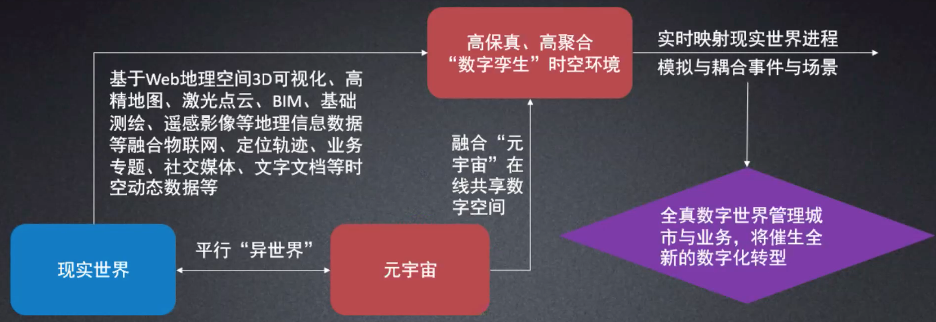 基于Web地址空间3D可视化、高精地图、激光点云、BIM、基础测绘、遥感影像等地理信息数据等融合物联网、定位轨迹、业务专题、社交媒体、文字文档等时空动态数据等信息构建一个高保真、高聚合的“数字孪生”时空环境,同时,通过实时映射现实世界进程,模拟与耦合事件与场景,可以实现全真数字世界管理城市与业务,将催生全新的数字化转型。