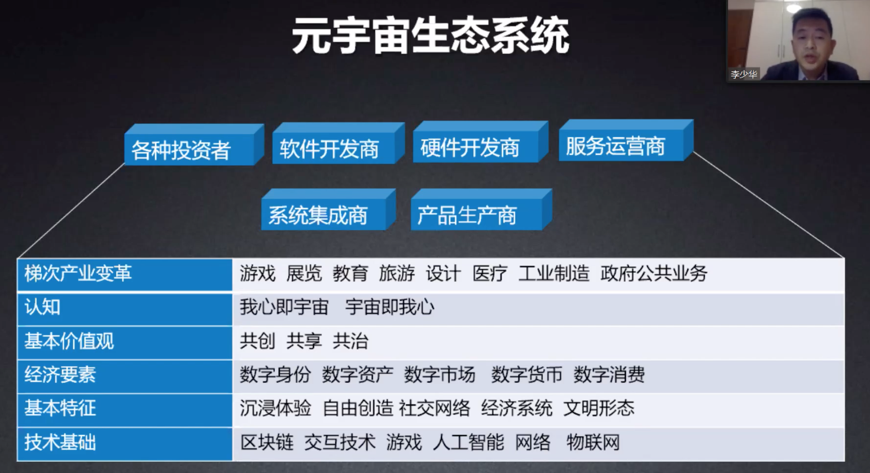 梯次产业变革涉及到非常多的行业,包括游戏、展览、教育、旅游、设计、医疗、工业制造、政府公共业务。认知,我心即宇宙、宇宙即我心。基本价值观,共创、共享、公治。经济要素,数字身份、数字资产、数字市场、数字货币、数字消费。基本特征,沉浸体验、自由创造、社交网络、经济系统、文明形态。技术基础,区块链、交互技术、游戏、人工智能、网络、物联网。