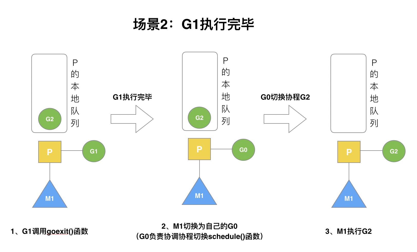 G1运行完成后(函数:goexit),M上运行的goroutine切换为G0,G0负责调度时协程的切换(函数:schedule)。从P的本地队列取G2,从G0切换到G2,并开始运行G2(函数:execute)。实现了线程M1的复用。