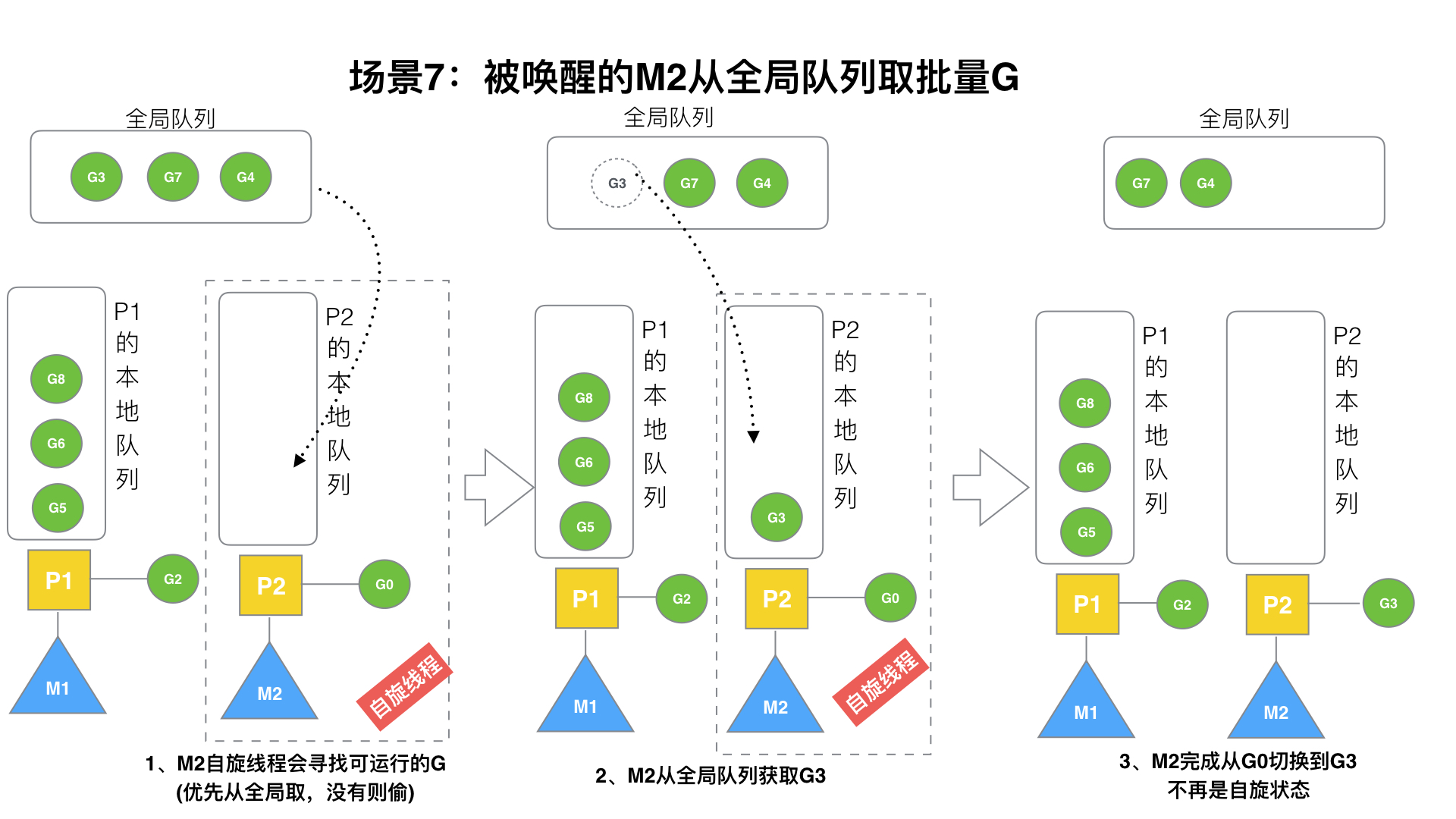 这些G被转移到全局队列时,会被打乱顺序。所以G3,G4,G7被转移到全局队列。