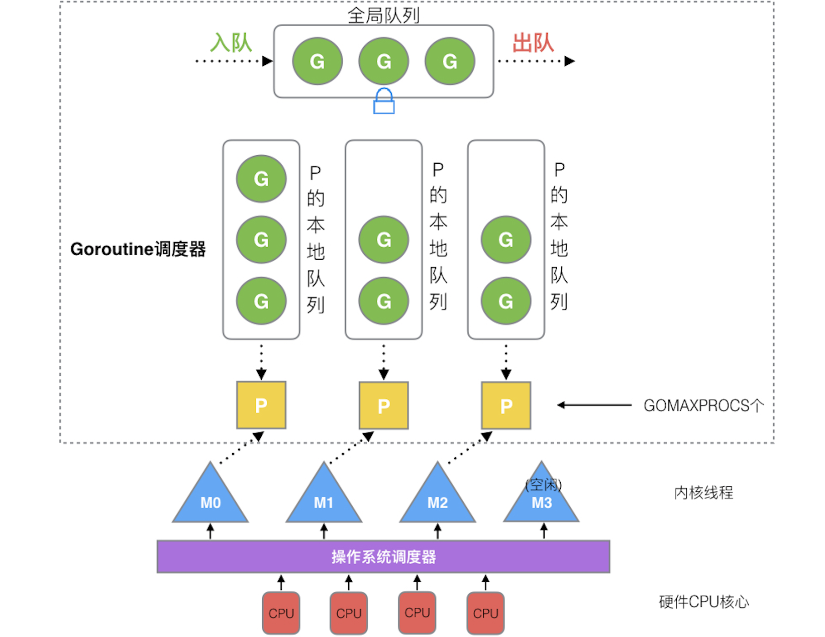 GOMAXPROCS(可配置)个。 - M:线程想运行任务就得获取P,从P的本地队列获取G,P队列为空时,M也会尝试从全局队列拿一批G放到P的本地队列,或从其他P的本地队列偷一半放到自己P的本地队列。M运行G,G执行之后,M会从P获取下一个G,不断重复下去。