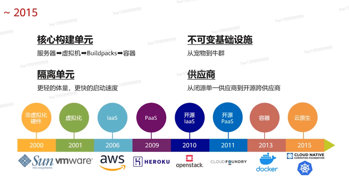 2000年SUN公司提出非虚拟化硬件,2001年VMware实践虚拟化的产品,2006年亚马逊提出IAAS(基础设施即服务),指把IT基础设施作为一种服务通过网络对外提供,并根据用户对资源的实际使用量或占用量进行计费的一种服务模式。2009年 提出Paas(平台即服务),将软件 研发的平台作为一种服务,以SaaS 的模式提交给用户。2010/2011是一个开源之年,各大厂商都推出了自己开源产品比如openstack,Cloud Foundry。2013年Docker进入大众的视野,Docker 是一个开源的应用容器引擎,容器是完全使用沙箱机制,相互之间不会有任何接口,更重要的是容器性能开销极低。2015年正式进入云原生元年,未来云原生一切。
