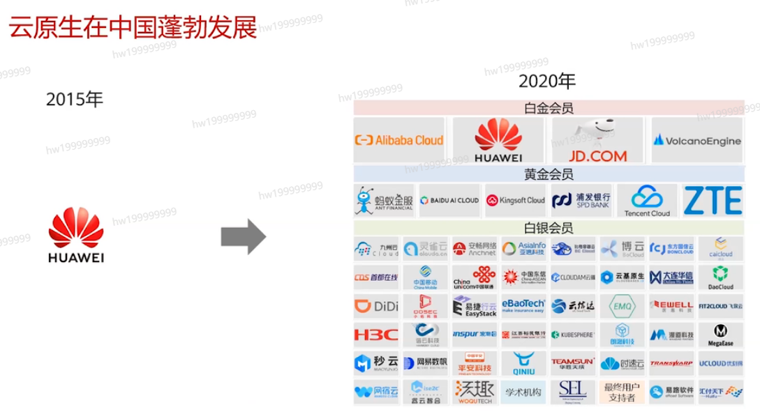 在中国,云原生的生态也飞速发展,CNCF的会员数量也从2015年的1家初创&白金会员发展到今天60家成员单位。