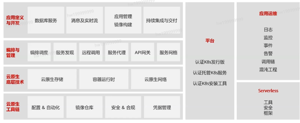 现在云原生的生态已经及其庞大,云原生生态圈划分为上下五层及共用两层,上下五层包括应用定义与开发层、编排与治理层、运行时层、供应保障层及云设施层,共用层包括观察与分析、平台。各大厂商已经纷纷涉足云原生的产品,国内大厂有华为云、阿里云、腾讯云等。