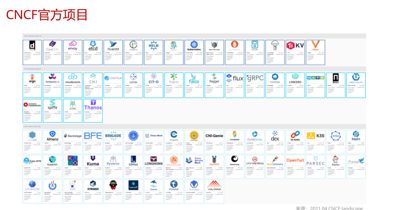 目前有15个毕业项目,21个孵化项目,46个沙盒项目,值得一提的是,CNCF的Sandbox经过流程优化之后,2020年增长速度明显提升。