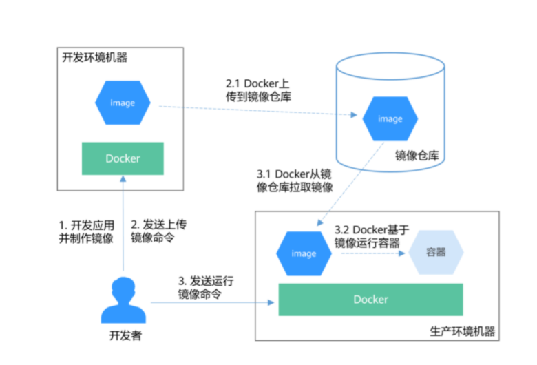 3. 开发者向生产环境机器发送运行镜像命令。生产环境机器收到命令后,Docker会从镜像仓库拉取镜像到机器上,然后基于镜像运行容器。