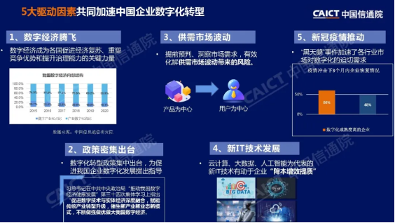 - 数字化转型的第一个驱动力是经济形势的挑战显现。在数字经济发展迅速的同时,我们也要看到中国市场整体经济的增速已放缓,特别是当前逆全球化的贸易保护主义抬头,企业面对着市场开拓、贸易壁垒、核心技术不足等诸多挑战。在经济环境压力越来越重的情况下,企业要应对消极因素的影响从而实现平稳的运营并追求长期的成长,驱使企业开始考虑通过数字化转型提升应对宏观困境的能力。其次是国家可持续发展战略对我国经济和社会发展的长远规划,它要求企业在供给侧落实绿色节能、改进产品结构、实现技术创新。因此企业必然要借助新兴技术手段,以合理的投入来满足监管的要求。