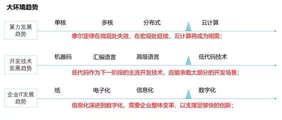因此,软件开发技术必须要演进到一种能低成本低门槛构建和使用IT服务的方式,才能支撑住企业数字化转型的时代。这正是低代码技术的使命和价值。因此低代码技术也是企业数字化转型的主要支撑手段。
