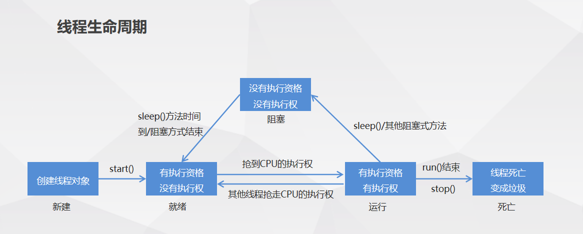 就绪:处于新建状态的线程被start()后,将进入线程队列等待CPU时间片,此时它已具备了运行的条件,只是没分配到CPU资源 。