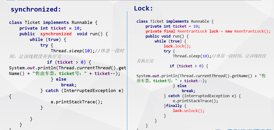 Lock只有代码块锁,synchronized有代码块锁和方法锁 。