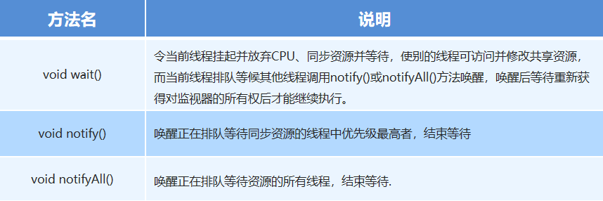 注意: 这三个方法只有在synchronized方法或synchronized代码块中才能使用,否则会报 java.lang.IllegalMonitorStateException异常。 因为这三个方法必须有锁对象调用,而任意对象都可以作为synchronized的同步锁, 因此这三个方法只能在Object类中声明