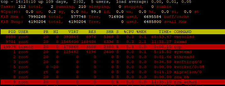 Cpu5 : 0.0%us, 0.0%sy, 0.0%ni,100.0%id, 0.0%wa, 0.0%hi, 0.0%si, 0.0%st