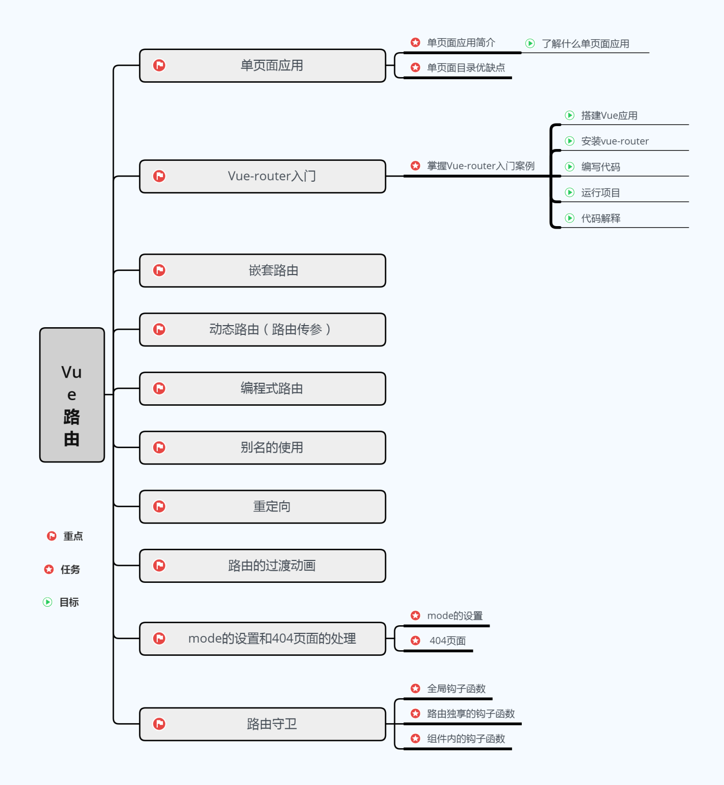 • 路由守卫有点类似于ajax的请求拦截器,就是请求发送之前先给你拦截住做一些事情之后再去发送请求。