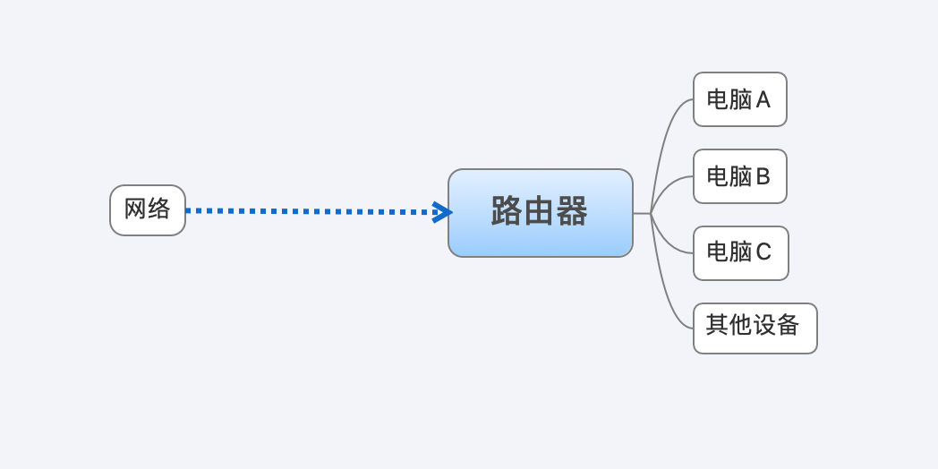 提起路由,读者应该很容易联想起来现实生活中的路由器,路由器是用来共享网络的,可以实现多台设备使用上网,也就是说虽然只有一根网线,也可以将数据分发给网络内的多个设备。路由器的原理如图12.1所示。
