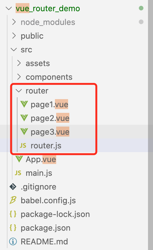 其中page1.vue,page2.vue,page3.vue为三个单页面,router.js作为vue路由功能模块js文件。