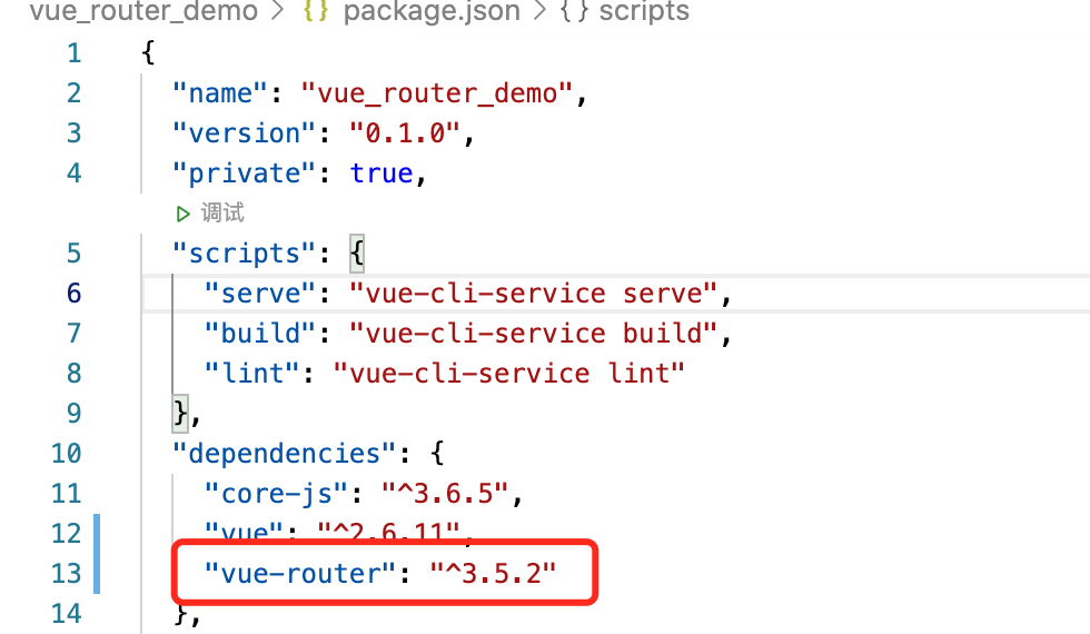 我们在命令行中输入npm install vue-router来安装vue-router,安装完之后我们可以打开package.json文件,在package.json文件中可以看到vue-router的版本号;如图12.4所示。