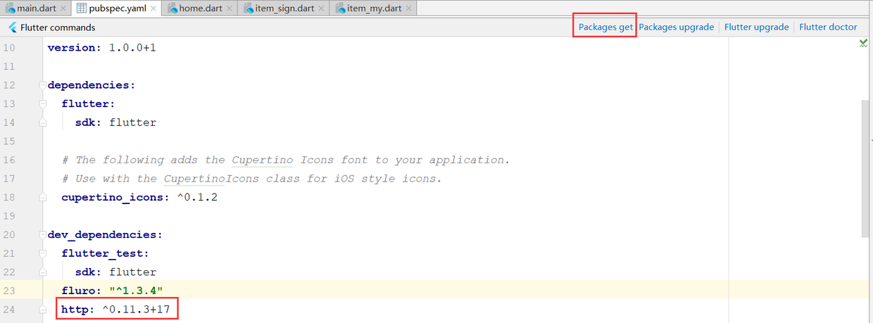 添加依赖,在 pubspec.yaml 中添加 http 依赖 http: ^0.11.3+17,之后 package get 同步;