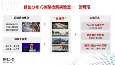 面对疫情防控难以快速定位、无法大量检测、缺乏分区分级的主要痛点,在钟南山院士主持下,广州实验室、金域医学等机构联合研发,推出业内创新的“猎鹰号”移动方舱实验室。
