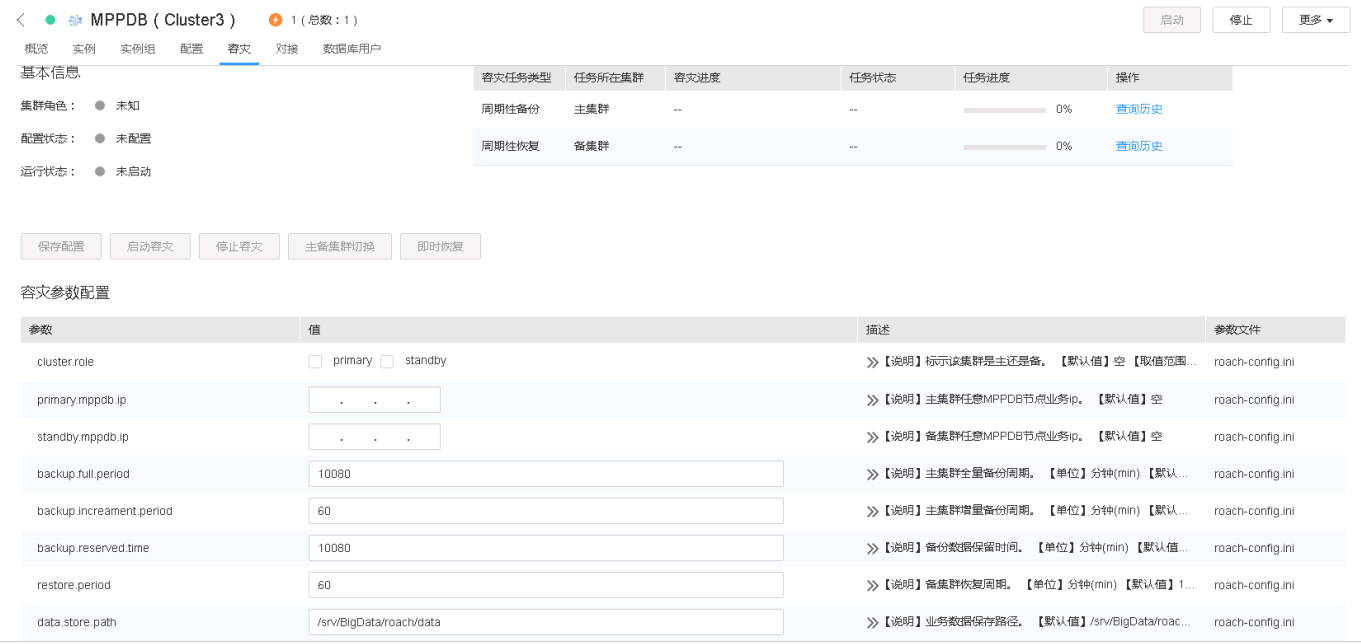 当主备集群部署完成后,我们需要对集群容灾参数进行配置,才能发起容灾任务。