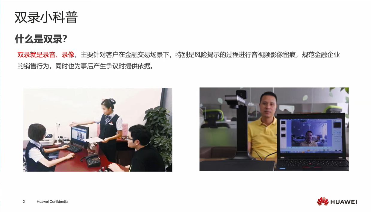 双录就是录音、录像。主要针对客户在金融交易场景下,特别是风险揭示的过程进行音视频影像留痕,规范金融企业的销售行为,同时也为事后产生争议时提供依据。