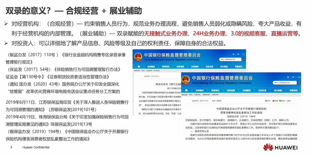 • 对经营机构: (合规经营) -约束销售人员行为, 规范业务办理流程,避免销售人员弱化或隐瞒风险、夸大产品收益,有利于经营机构的内部管理。(展业辅助)一双录赋能的无接触式业务办理、 24H业务办理、3.0的视频客服、直播运营等。