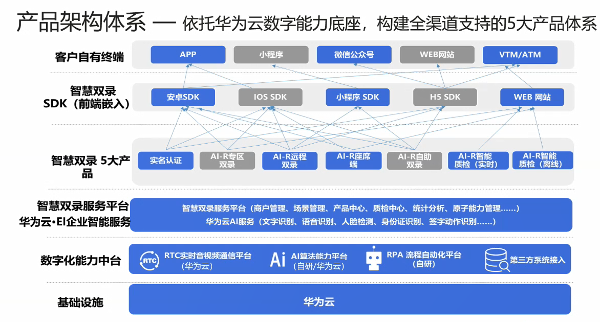 为了实现智慧双录的目标,打造了智慧双录的全景图,从最上层角度来讲,其实就是各个金融机构相应的场景,无论是信托、保险、银行这种常见的金融机构场景。通过上述的三种技术,RTC、AI、RPA这三种技术驱动来生成了不同的五大类的产品,来帮助各个金融机构来实现智能化的服务场景。