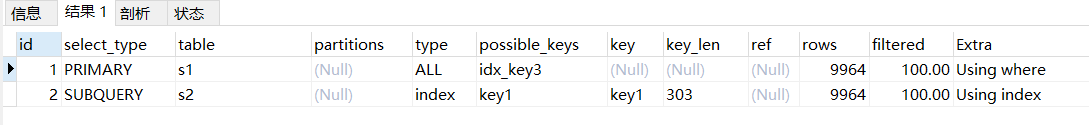 Id为2 其实是 select key1 from s2 结果集物化, 外层select 与结果集进行连接查询