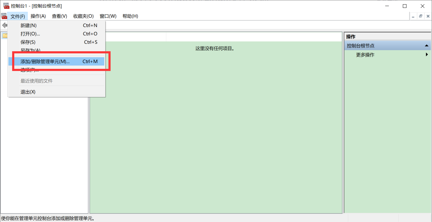 在MMC控制台菜单栏中单击“文件”,选择“添加/删除管理单元”。