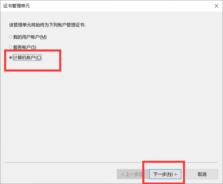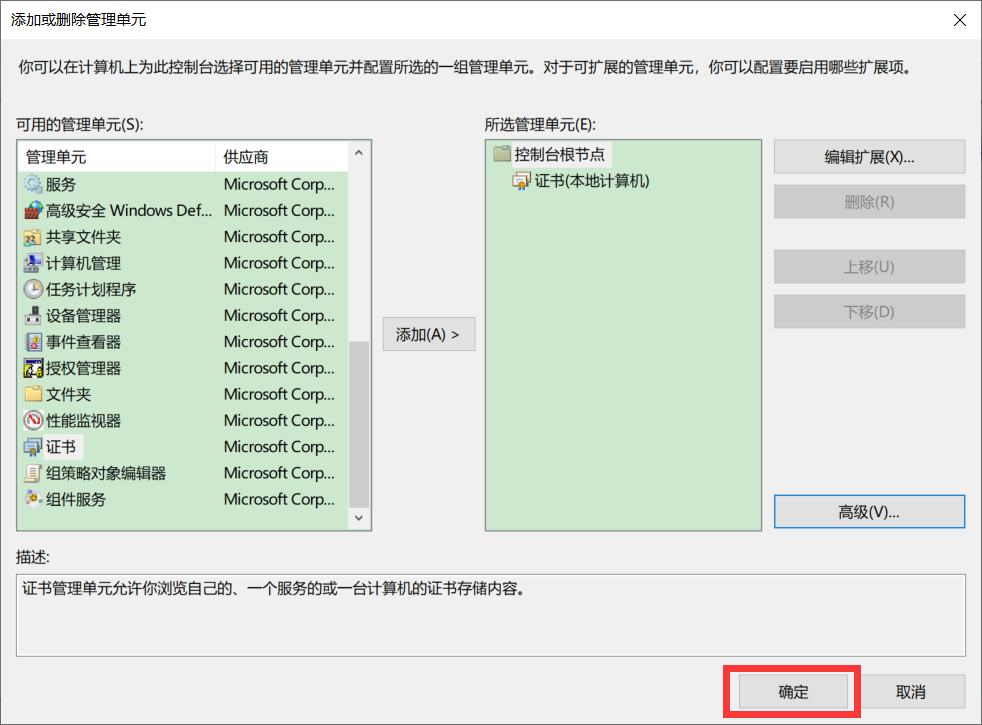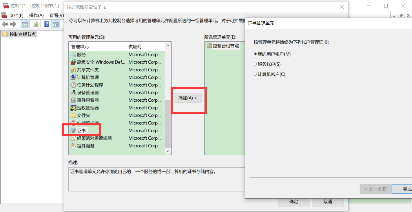 在“添加或删除管理单元”对话框,选择“可用管理单元”区域的“证书”。单击“添加”添加证书