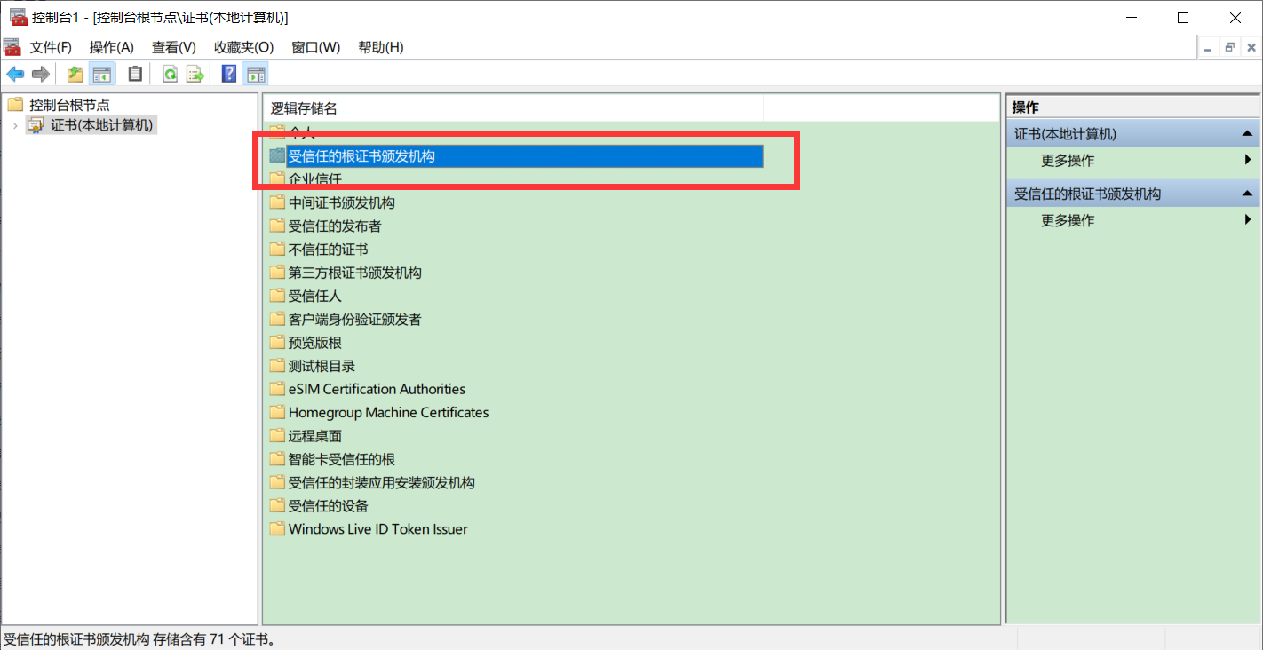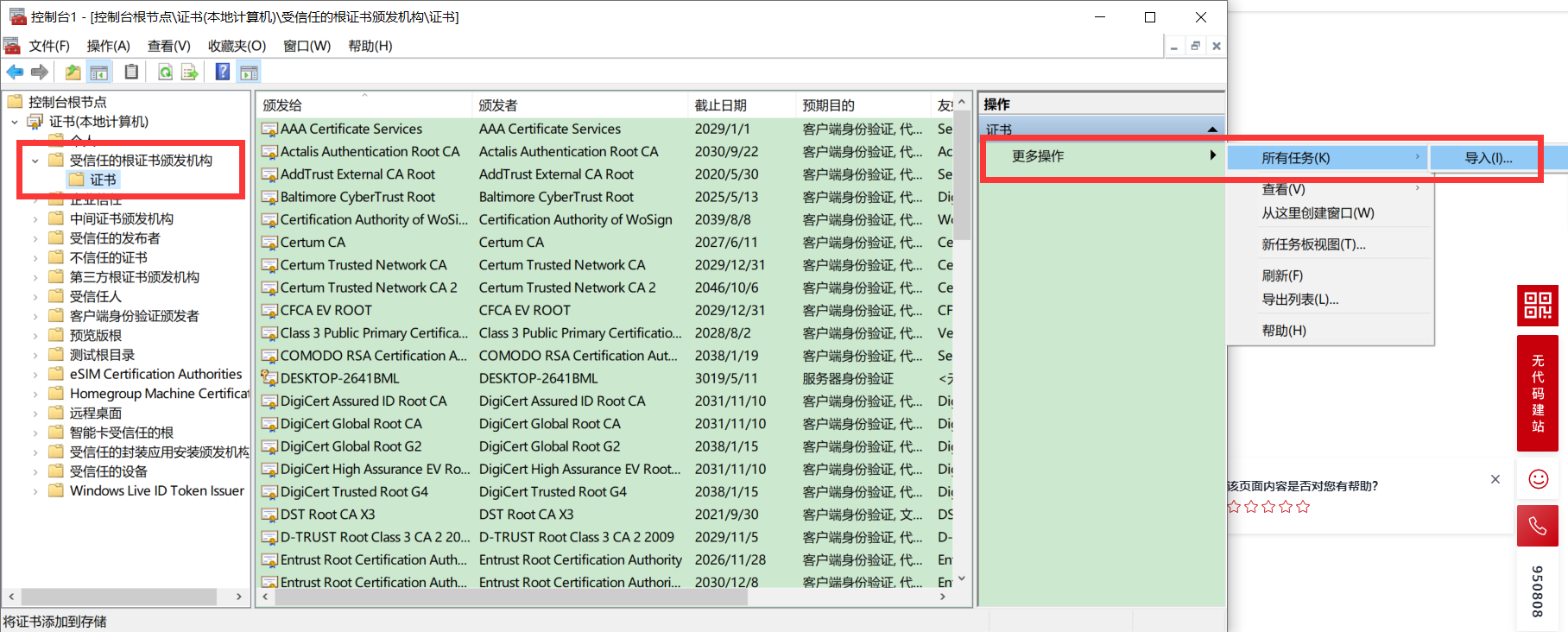 在证书处双击即可,选择到【受信任的根证书颁发机构】选择“所有任务”,单击“导入”。