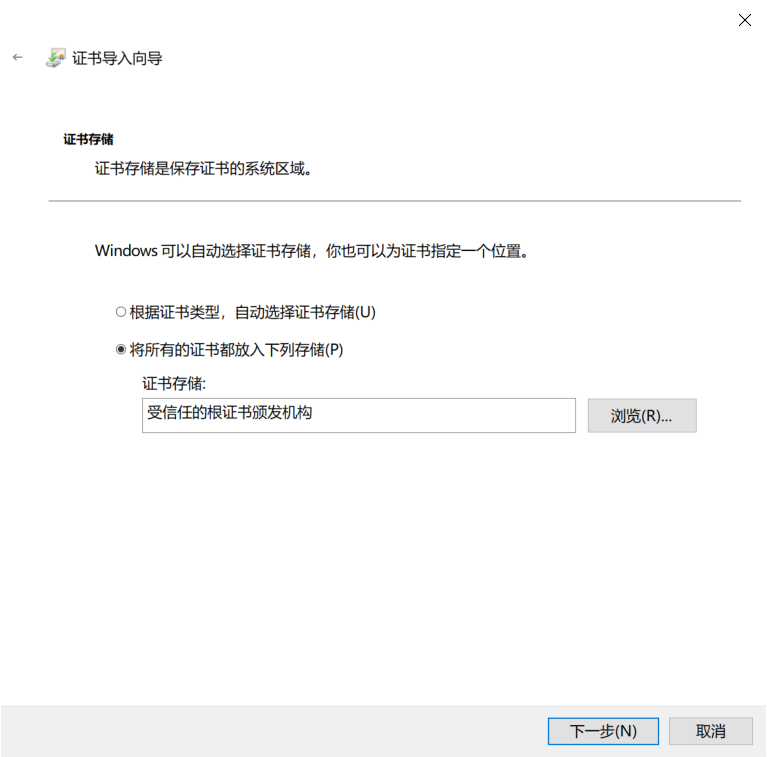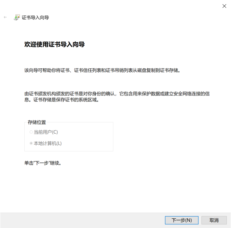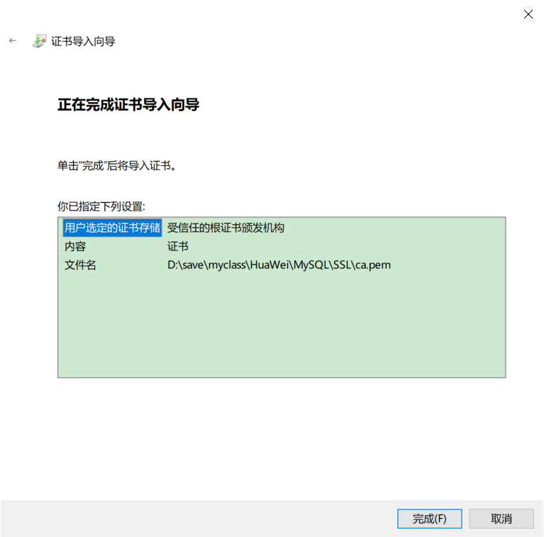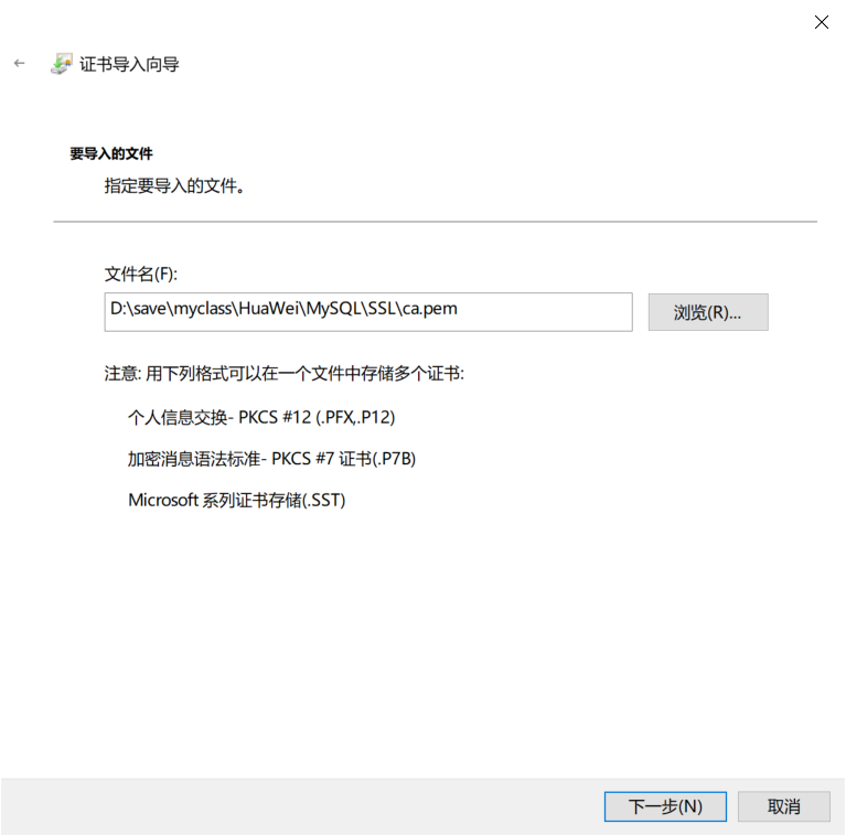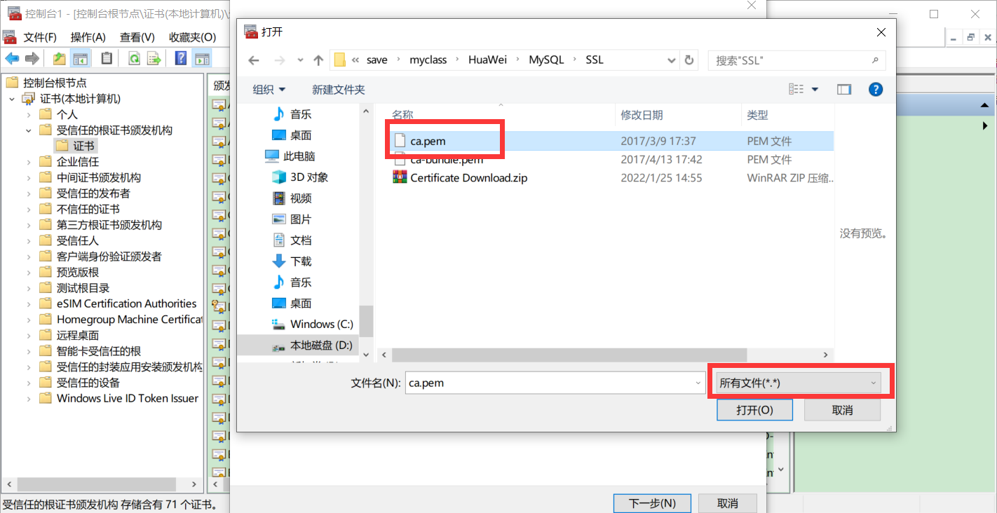 - 找到下载的根证书ca.pem文件,单击“打开”,然后在向导中单击“下一步”。