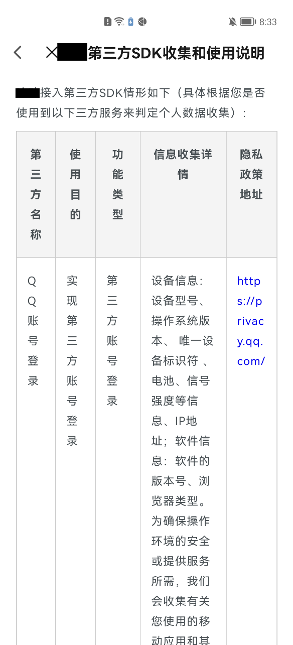 图1 正文中的第三方SDK隐私声明 图2 第三方SDK隐私声明链接 图3 表格形式呈现的第三方隐私政策