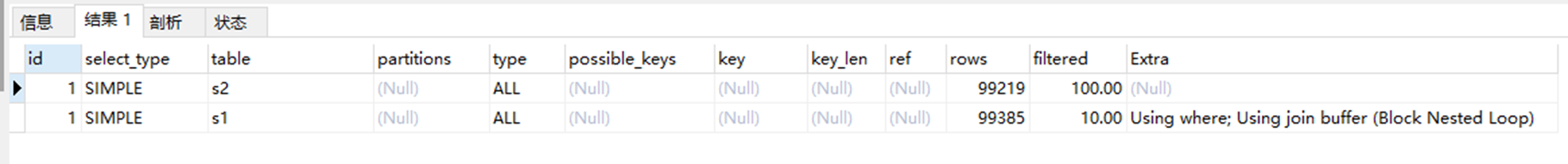 # using join buffer 对于 被驱动表S2 没用到索引, 使用where 是因为对应s2 where s2.commen_field= 一个常数 需要在server层进行判断