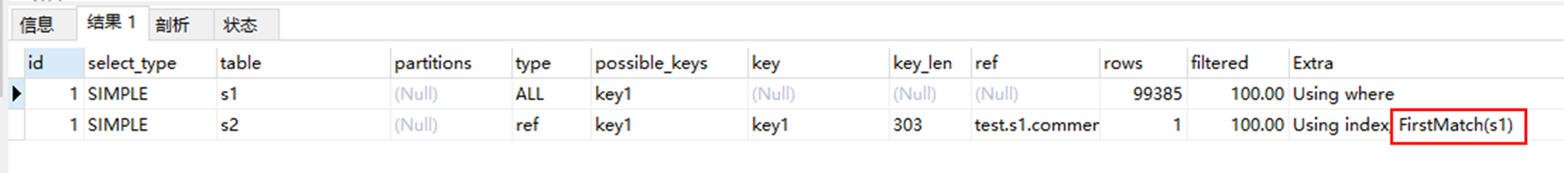 # 其实优化器将SQL 优化成 select * from s1 semi join s2 on s1.key2 = s2.key2 where s2.commen_field = "alex" 将s2 当成了驱动表
