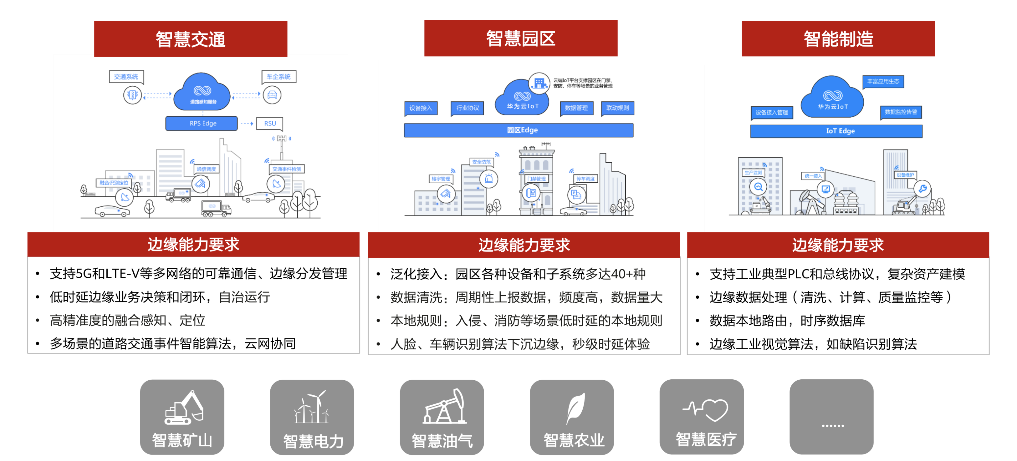 IoT Edge 云服务场景丰富,较为成熟的包括智慧交通、智慧园区、智能制造、智慧矿山、智慧店里、智慧油气、智慧农业、智慧医疗等方方面面,接下来以智慧交通、智慧园区和智能制造三个应用场景为案例介绍,每个案例从客户痛点、边缘价值和场景特点三部分进行介绍;